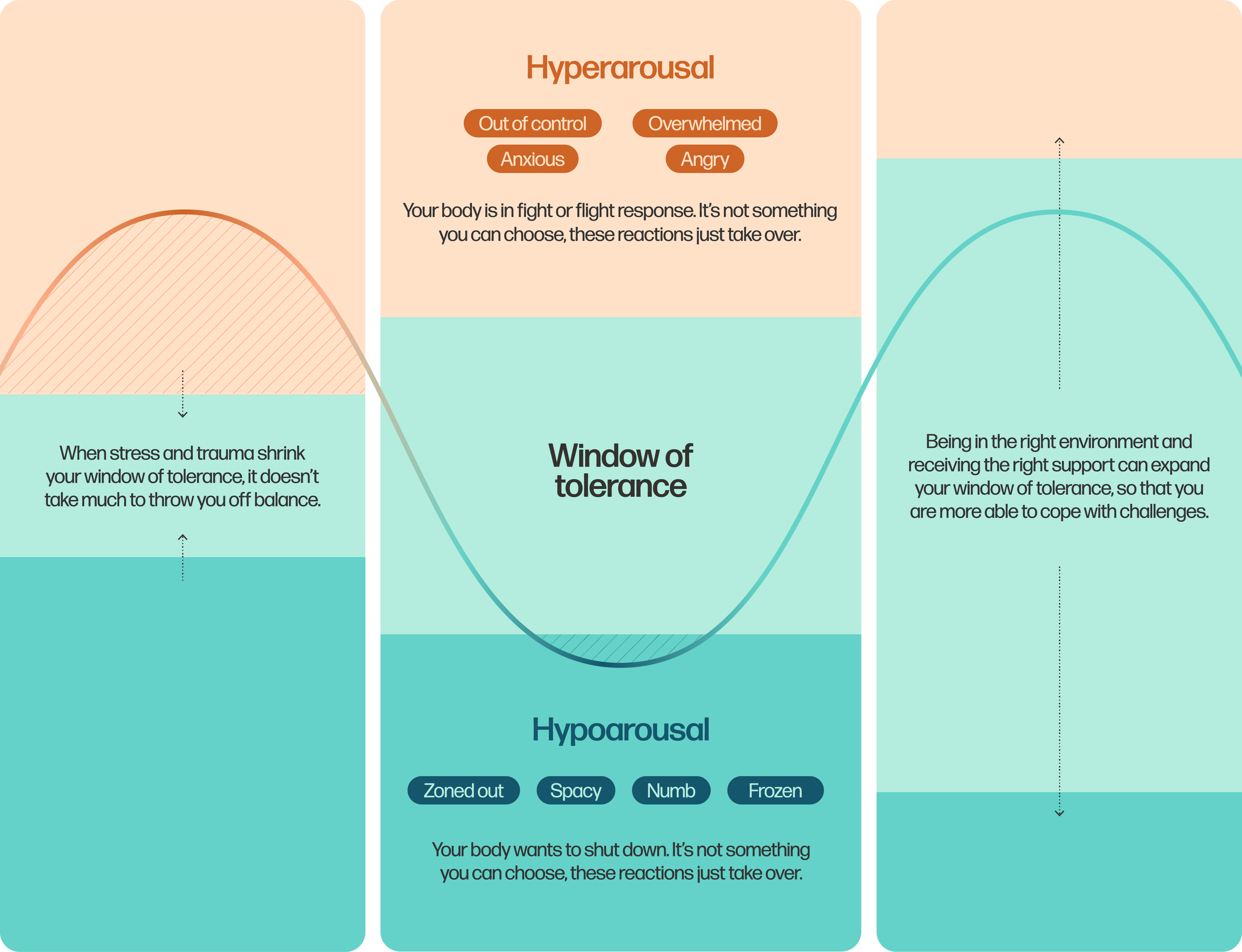 The window of tolerance is often described as our zone of resilience—the state in which we can manage everyday stressors, stay regulated, and function effectively. Within this window, our nervous system can process arousal and emotional experiences without becoming overwhelmed. Our capacity refers to how much we can be with, tolerate, and digest the emotions, sensations, and experiences of the present moment. It is important to note that if someone’s window of tolerance is small to begin with (due to stress, trauma, the sensory environment or social processing differences) escalation and dysregulation can happen rapidly. In addition, everyone has varying limits in what they can tolerate physically, emotionally, socially, spiritually, psychologically, and verbally. Being able to identify signs of dysregulation in ourselves and others and choosing to de-escalate through self-soothing and co-regulation is key.